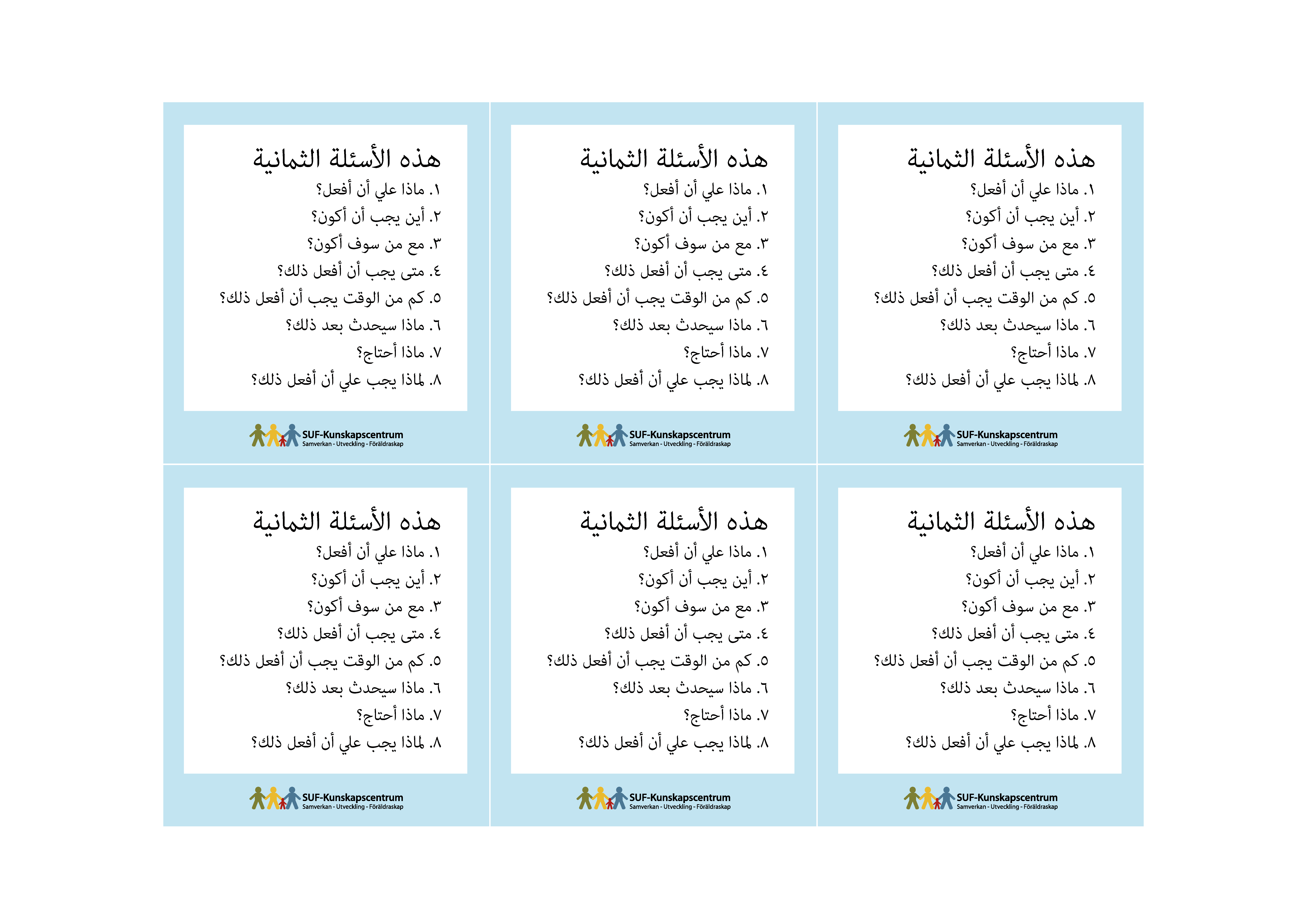 De åtta frågorna är bra att utgå ifrån för att undvika missförstånd och stress. Både föräldern och den yrkesverksamme bör besvara de åtta frågorna så att det blir tydligt vad som har överenskommits.