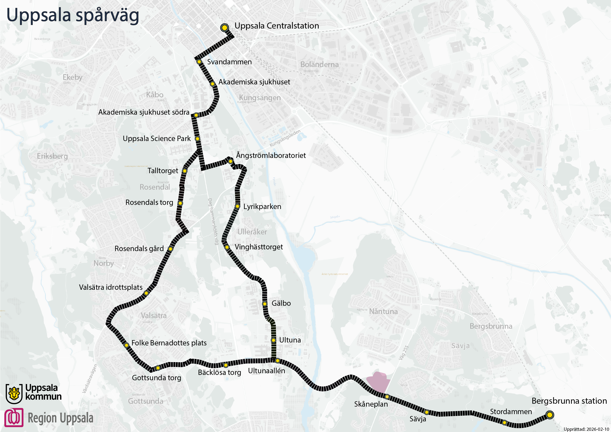 Karta över nya spårvägssträckan som dras från Bergsbrunna över Fyrisån till Ultuna där den delar sig i två grenar. En gren passerar Gottsunda och Rosendal. Den andra grenen passerar Ulleråker och Ångströmlaboratoriet. De två grenarna går ihop igen vid Uppsala Science Park och vidare via Akademiska sjukhuset till Uppsala centralstation.